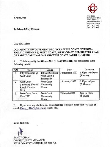 I am a graduating Secondary 4 student in Hillgrove Secondary School. Not only have I served the community in my CCA, Girls Brigade, I also volunteer under Park Residents Network, (Peoples Association, West Coast GRC).